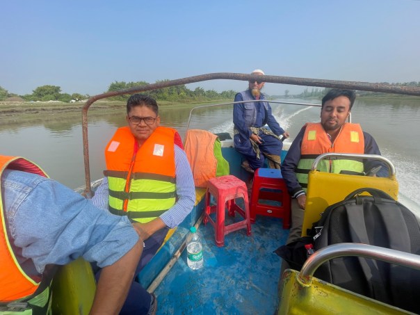 Photo 3 Caption: Nozrul and Kawsar on the outboard motorboat headed for Dhalchar.