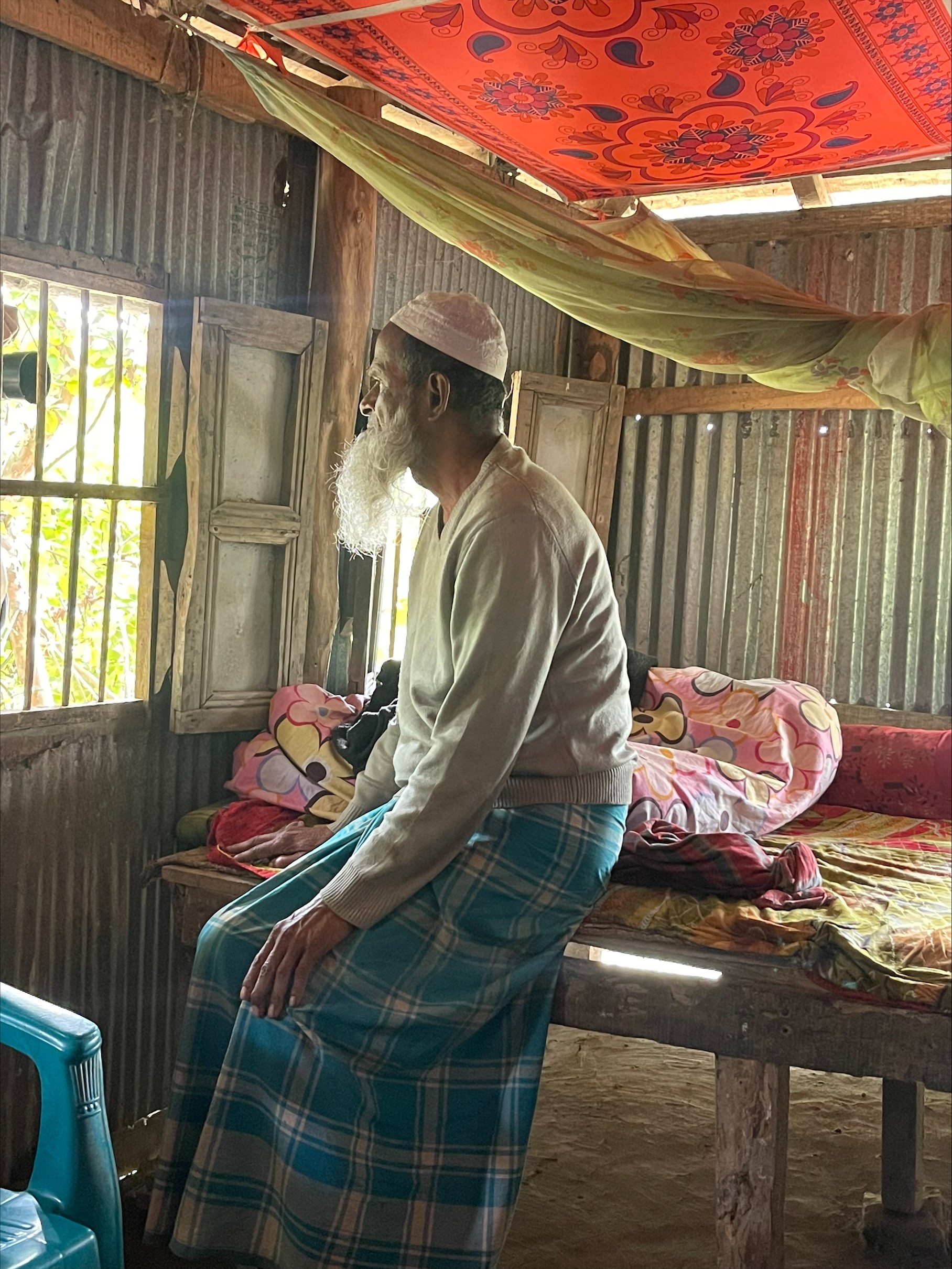 Photo 5 Caption: Mr. K., our first Dhalchar to Char Fasson transport client in his home.