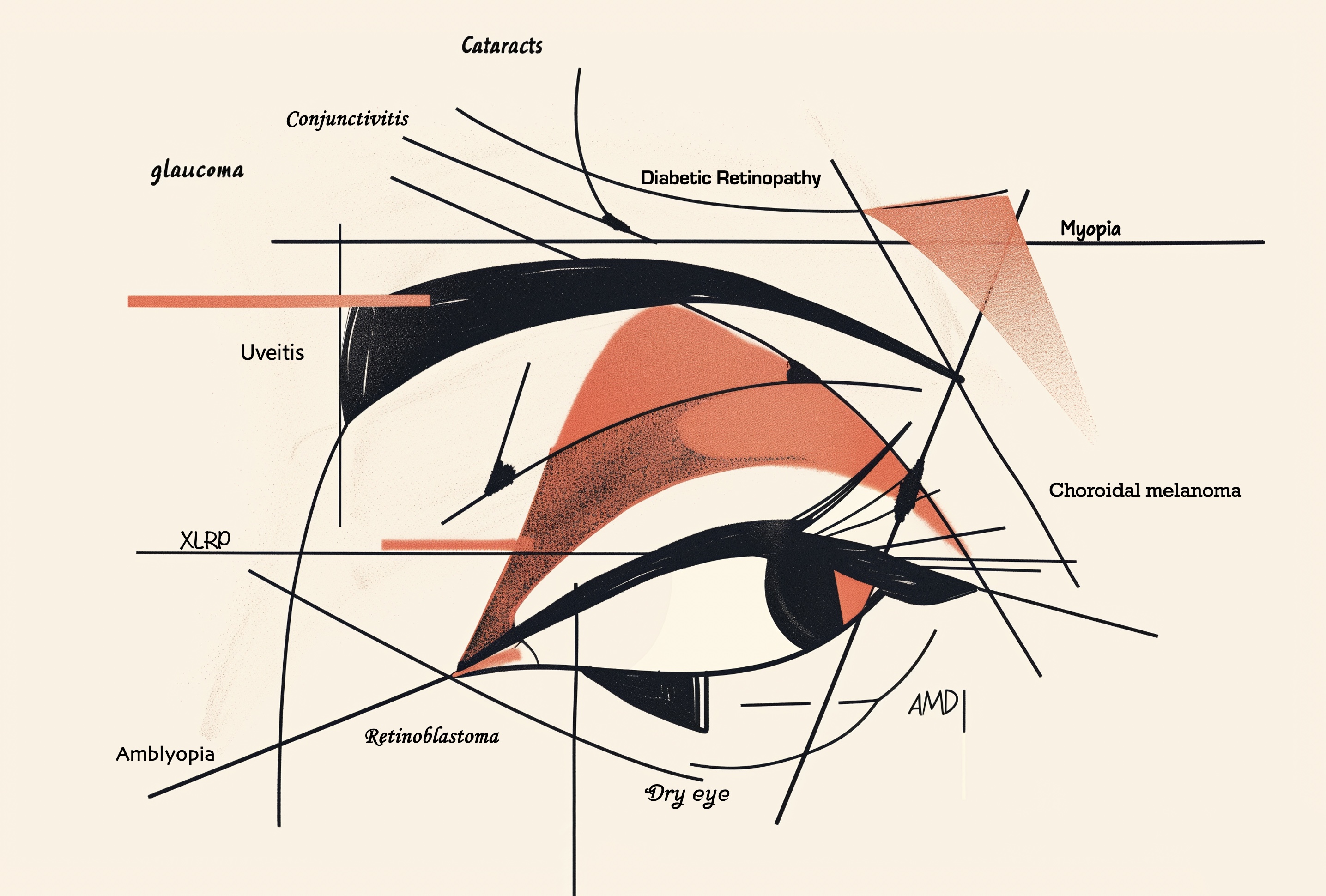 “Vision’s Fragility” is a digital illustration that combines abstract design elements with meaningful text. The focal point of the image is a striking representation of a human eye, composed mainly of geometric shapes and lines. The predominant use of black, accented with touches of bold red and soft peach tones, creates a visually compelling contrast that suggests both the fragility and the inherent vitality of human sight. Intersecting lines cut through the eye, drawing the viewer’s attention to carefully placed text that lists various eye conditions, such as age-related macular degeneration (AMD), glaucoma, cataracts, diabetic retinopathy, and X-linked retinitis pigmentosa. Each eye condition is thoughtfully written in a distinct font, adding depth and character to the artwork. The varied typography not only enhances the visual appeal but also symbolizes the unique challenges and experiences associated with each condition, emphasizing that each person’s journey with sight is deeply personal and complex.